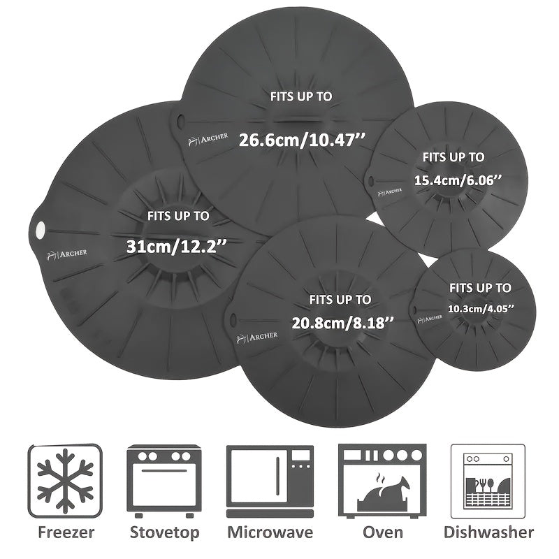 [MULTIPURPOSE VERSATILITY]Totally 5 Sizes- 4 inch, 6 inch, 8 inch, 10 inch and extra large 11.7nch. The sizes in between vary and they will fit almost anything!! Such as Pot, Pan, Dish, Plate,Bowls,Container,Coffee Cup Jar,Can and more. Great for Cooking and Baking.Also Perfectly and Safely use for Microwave, StoveTop, Oven, Fridge and Freezer Safe. Withstands temperatures from -104 degrees F to 450 degrees F.