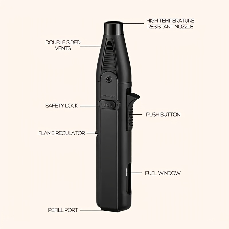 Rappel amical : En raison des réglementations de sécurité des transports, ce briquet à torche ne contient pas de gaz butane. Vous devrez préparer votre propre gaz butane pour le remplissage.
