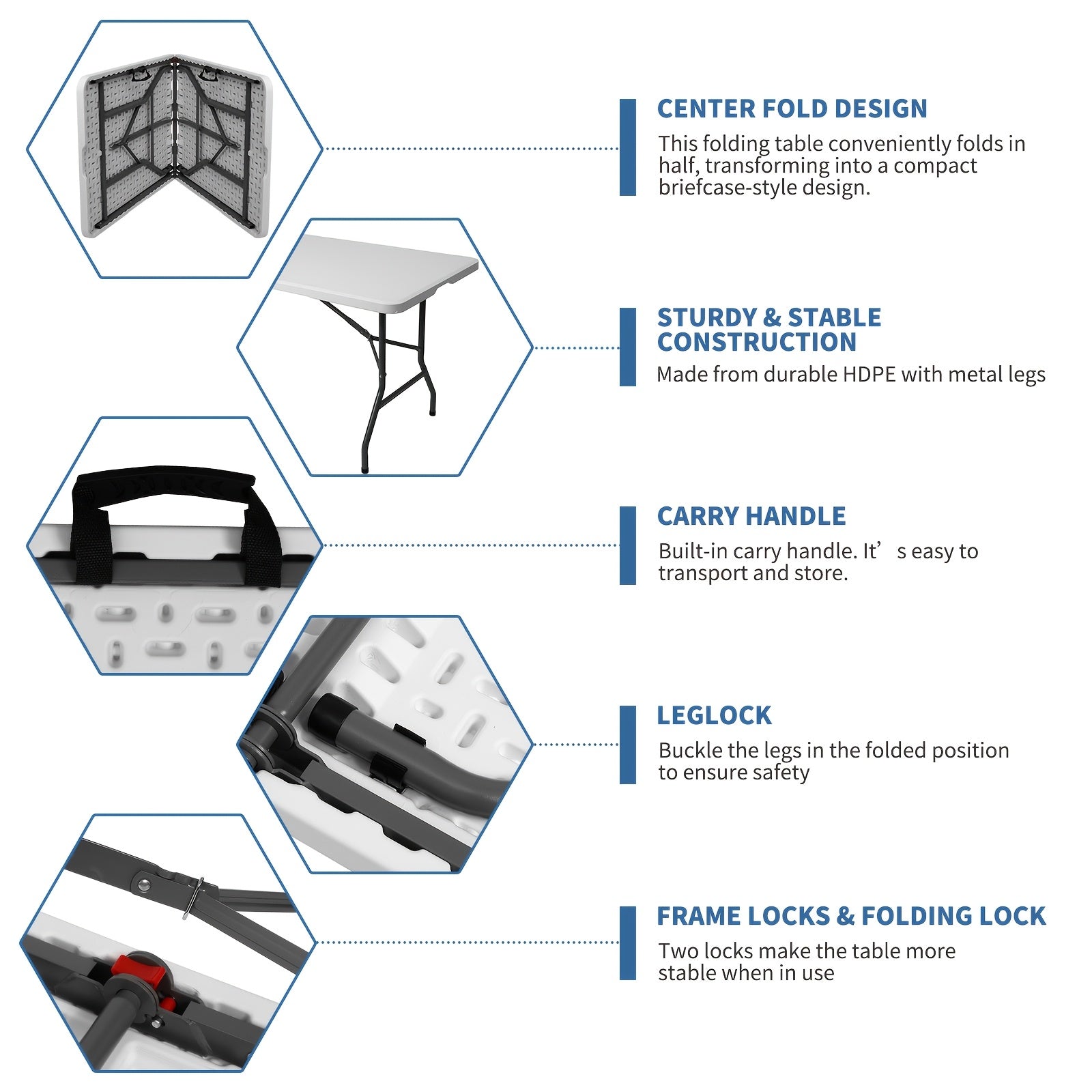 Table pliante en plastique 4ft/6ft, table à manger portable intérieure extérieure avec poignée de transport, verrous - Blanc