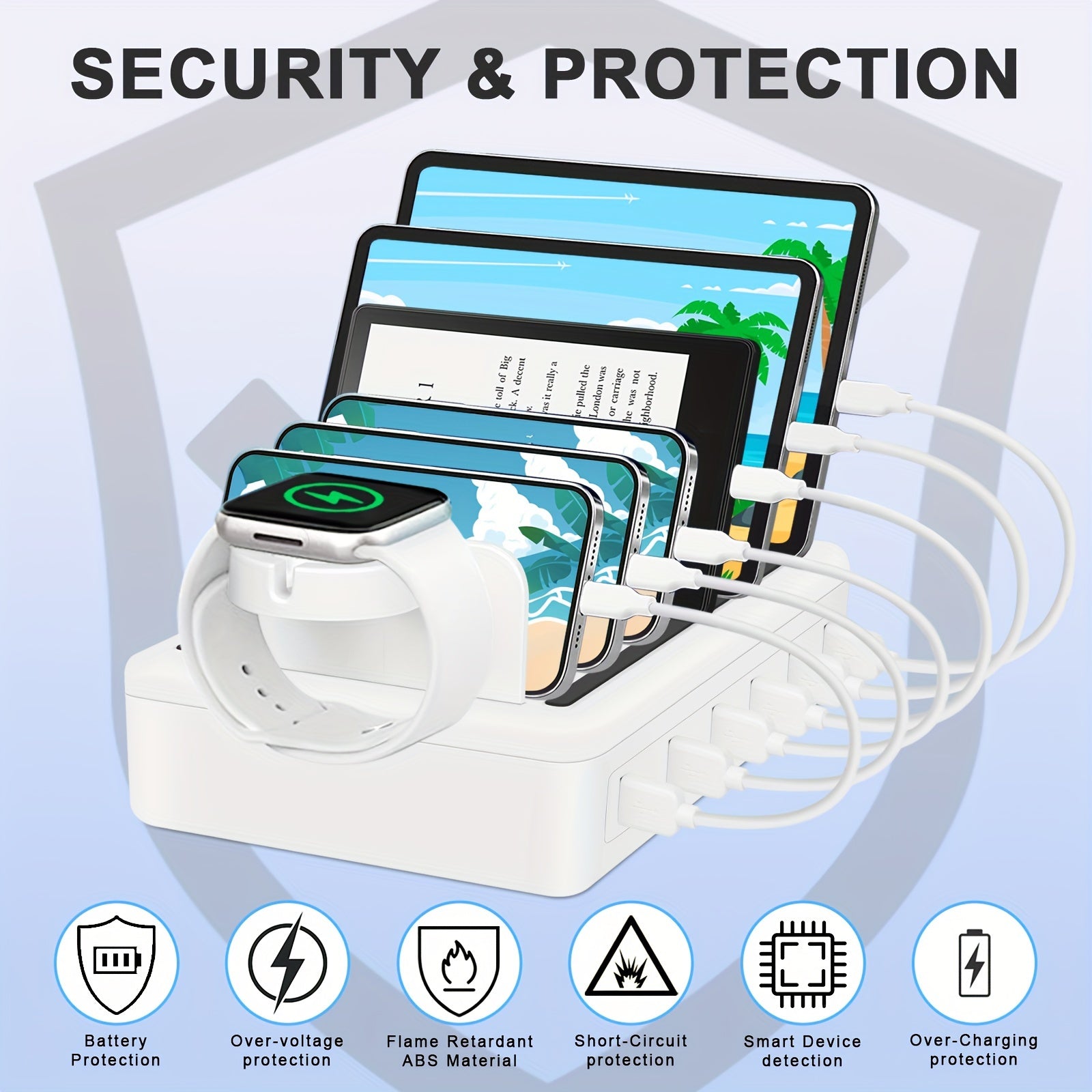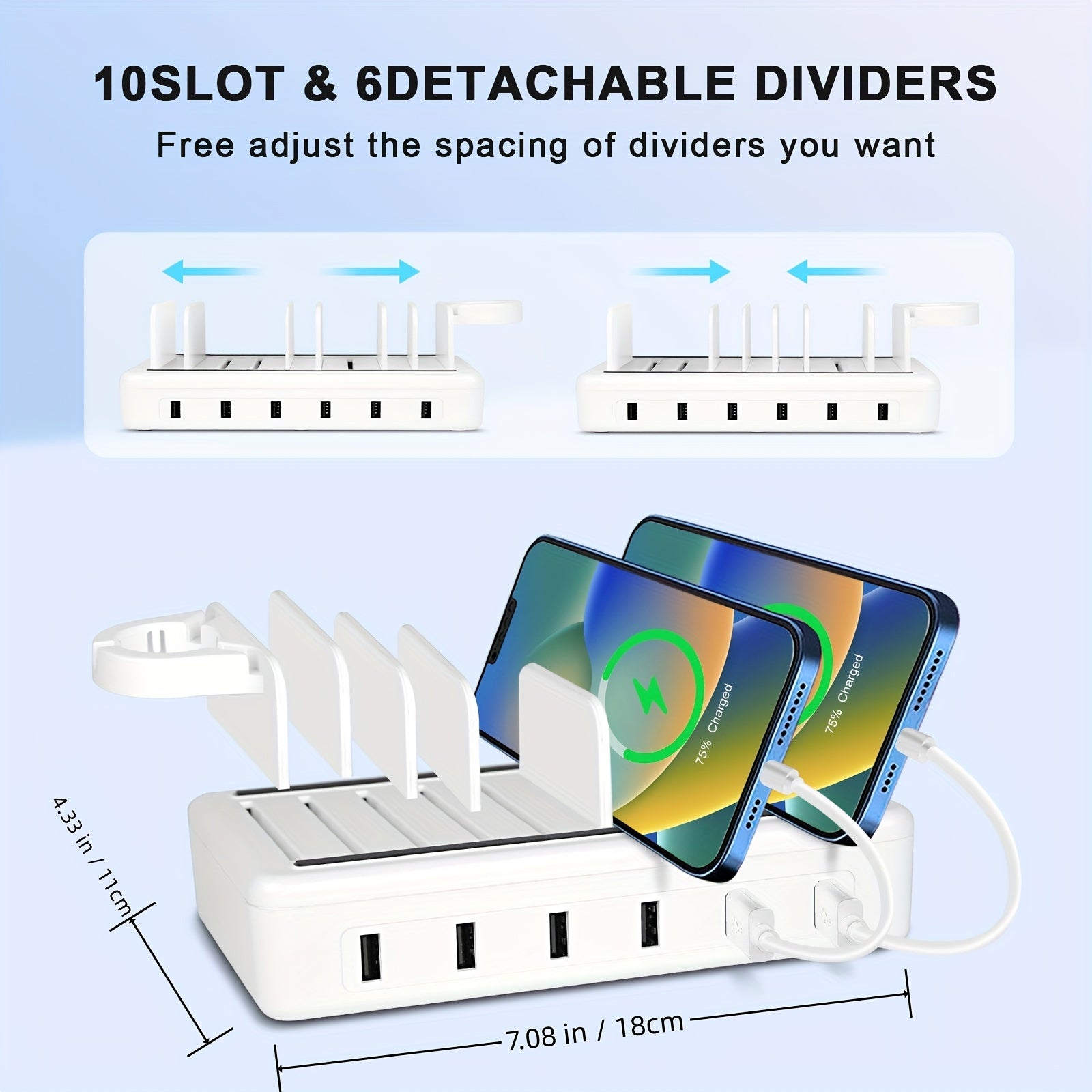 50W 6-Ports Fast Charging Station - Multiple Devices USB Charging Station With 10-Slot, Detachable Dividers, Watch Holder - Compatible With Phone/iPad/Kindle/Tablet