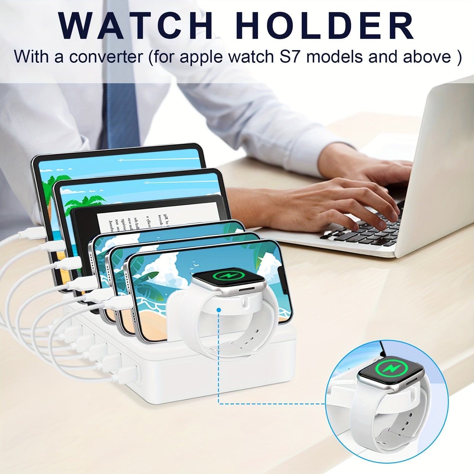 Our multi-device charging station features a watch holder and a Type A to C adapter. It comes with smart chips that ensure compatibility with your phone, tablet, watch, and earbuds. This makes it an ideal gift for the family.