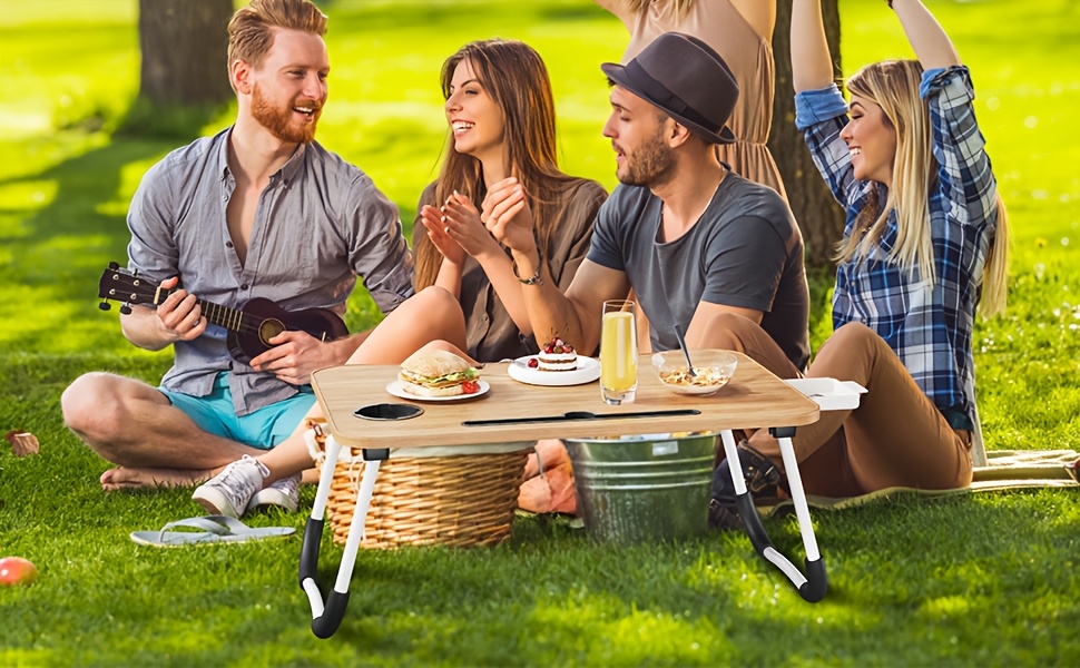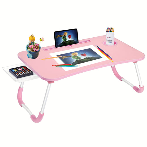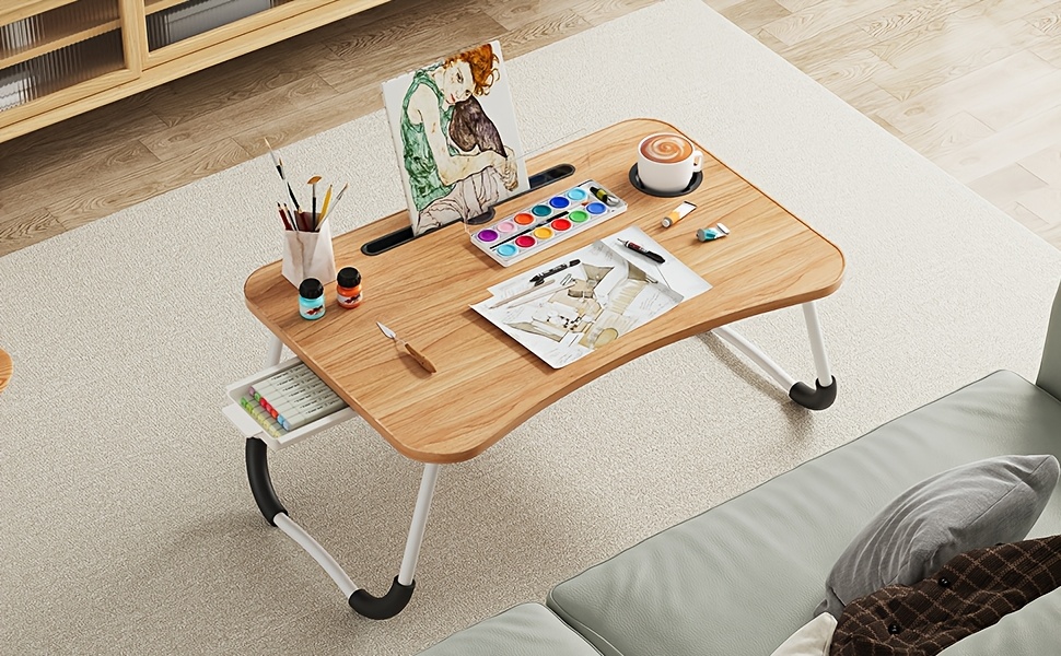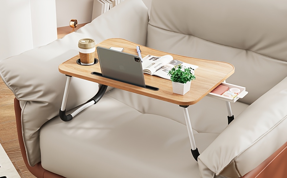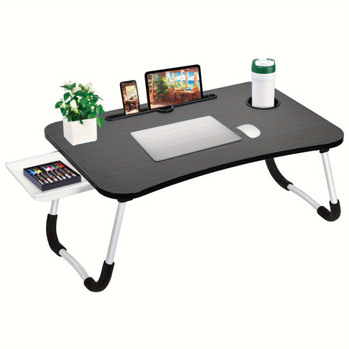 Portable Foldable Laptop Bed Desk Tray with Cup Holder & Drawer - Hardwood & Metal Construction, Large Lap Table for Reading, Writing & Studying - Ideal for Bed, Sofa, Couch - No Assembly Required, Laptop Table for Bed
