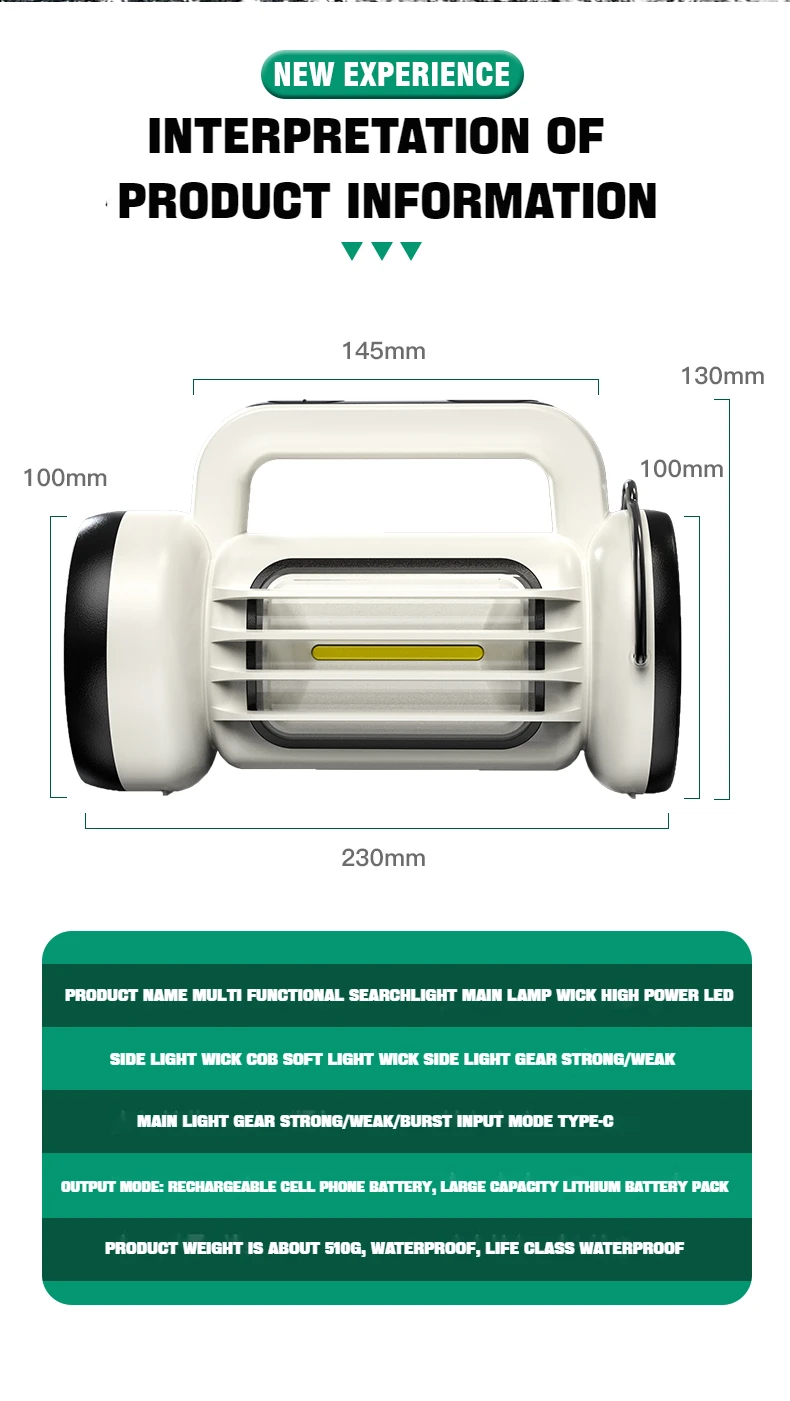 【Faro ad alta potenza】: tempo di scarica: 6 ore Luce laterale: COB: luce singola, tempo di scarica: 7 ore, tempo di scarica a doppia luce: 4 ore