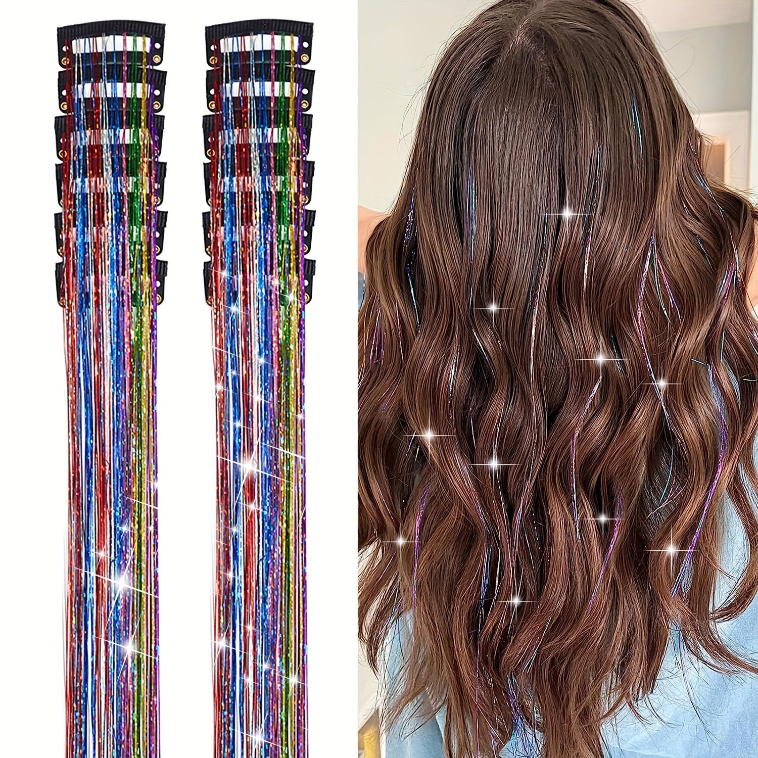 12Pcs Hair Tinsel Clip In 19.6Inch Tinsel Hair Extensions Clip In Hair Tinsel Kit Heat Resistant Shiny Sparkle Glitter Hair Extensions Fairy Hair Accessories For Women