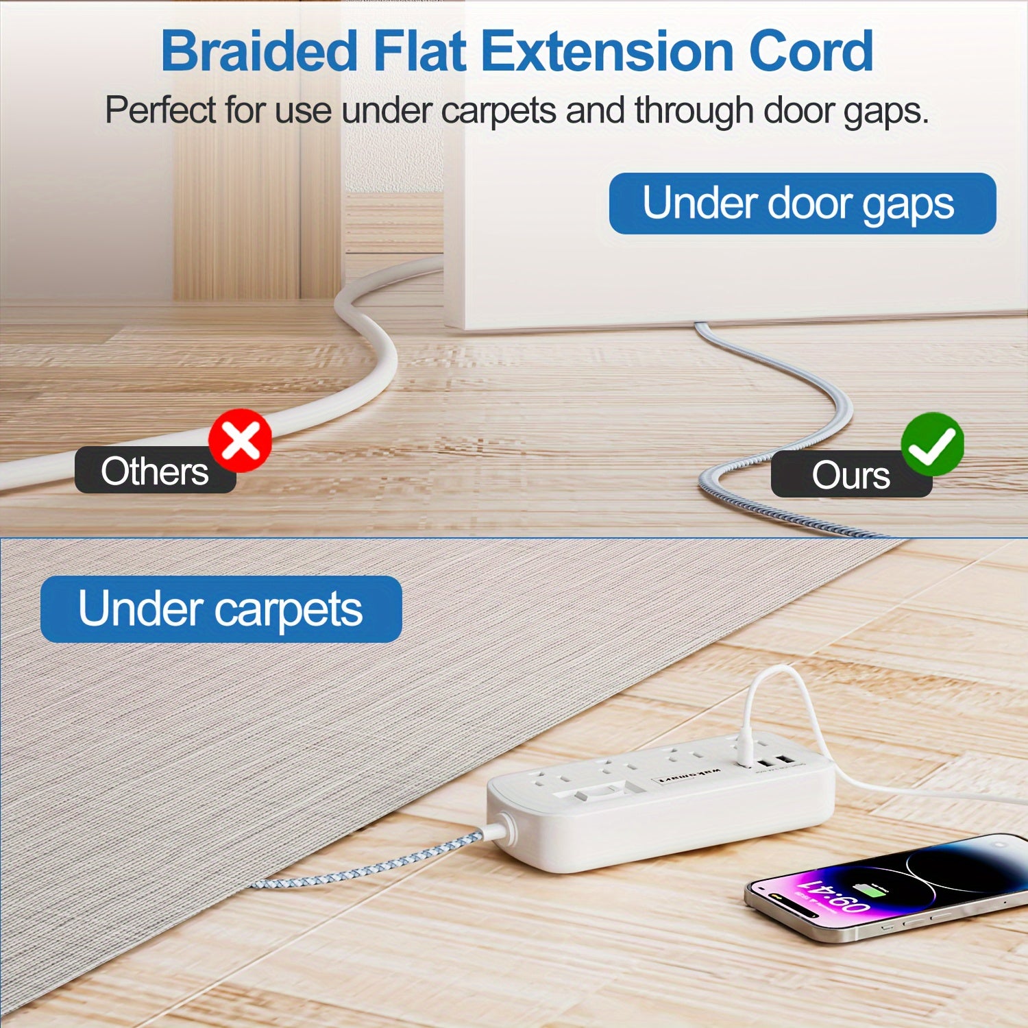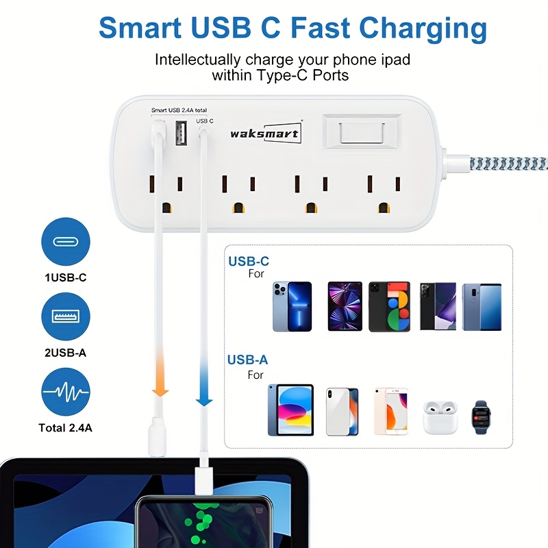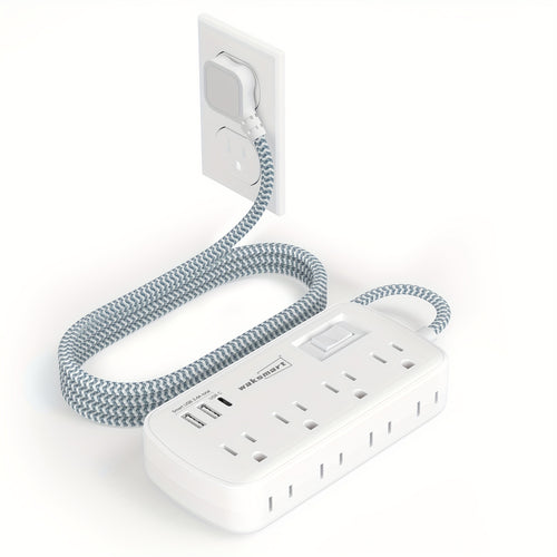 Compact 8-Outlet Surge Protector Power Strip with 3 USB Ports (1 USB-C) - Wall Mountable, 5ft Braided Flat Extension Cord, ETL Certified - Waksmart for Office, School, Dorm