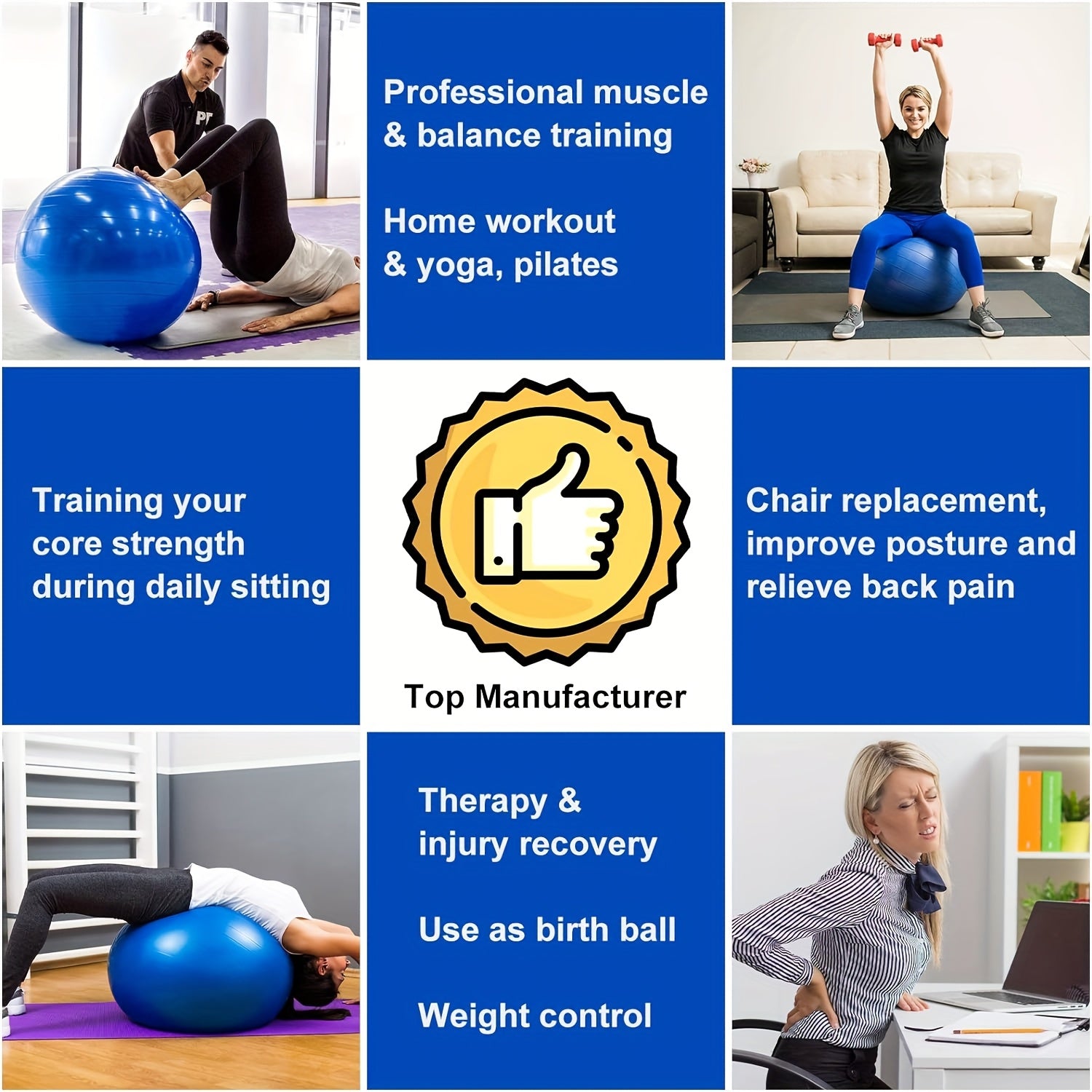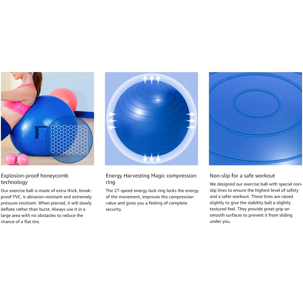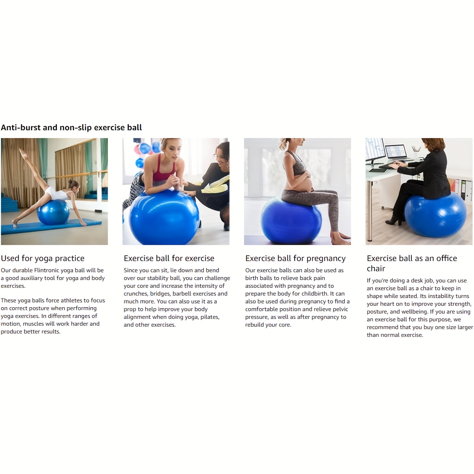 Multi-Purpose Use: Excellent for pilates, yoga, core and back workouts, prenatal exercises, or numerous low-impact routines, it can also serve as an office chair ball to enhance posture and alleviate back discomfort.