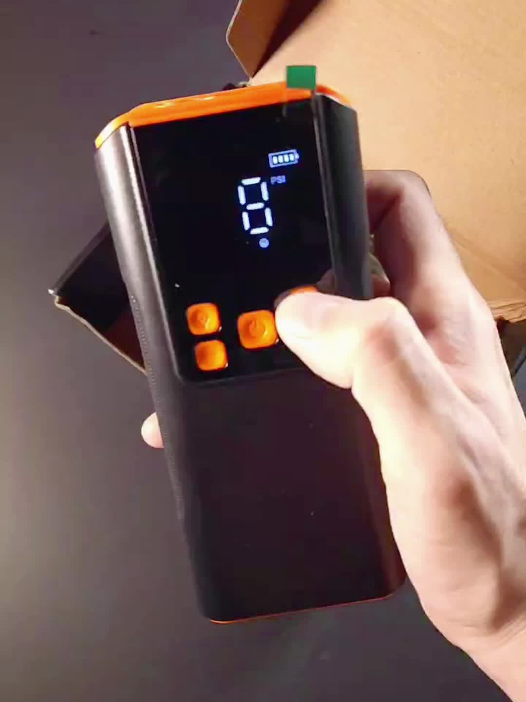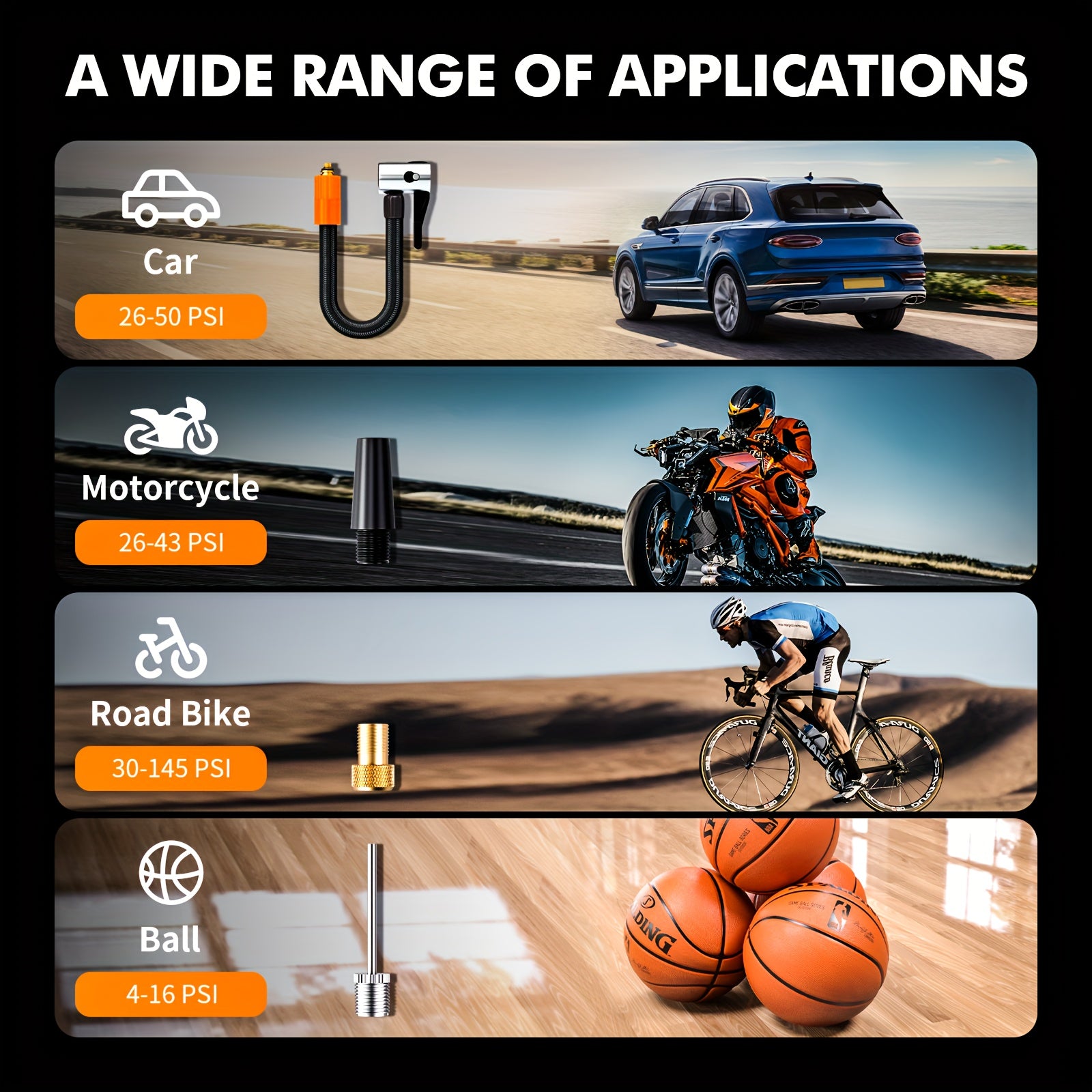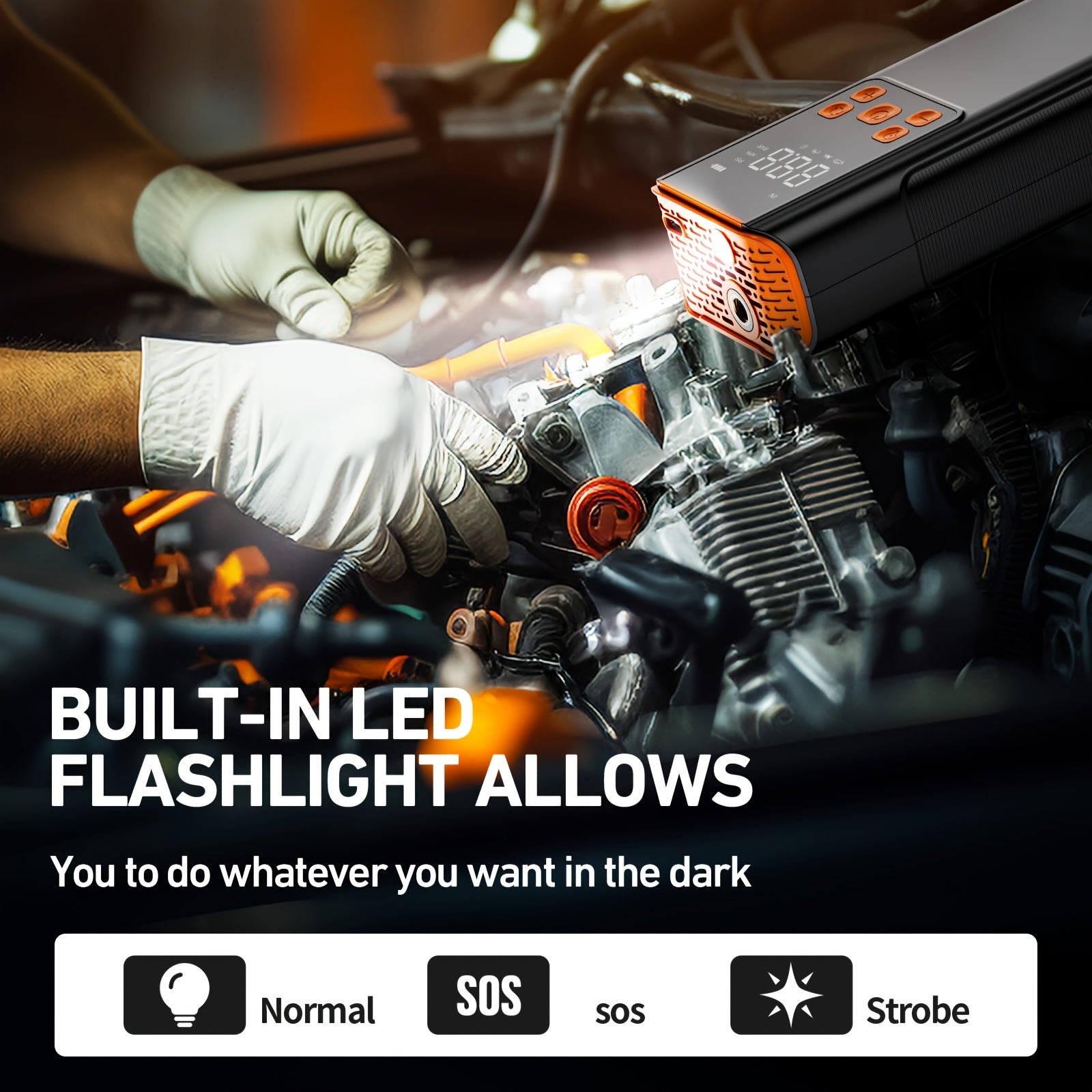 [Digital Display & LED Lighting]: This tire inflator with pressure gauge with LED screen can clearly show 4 preset inflation modes (bicycle, motorcycle, car, ball), and the air compressor pressure gauge has 3 pressure units to choose from: PSI, KPA, BAR. The tire air pump is equipped with 600LUMEN bright and long-lasting LED lights.